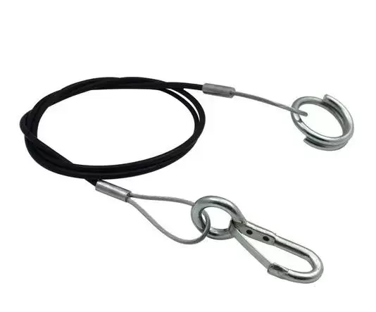 Safety cable for hitch balls for trailers and caravans made of steel covered with plastic sheath, with ring and carabiner for easy installation of 110cm and 102kg.