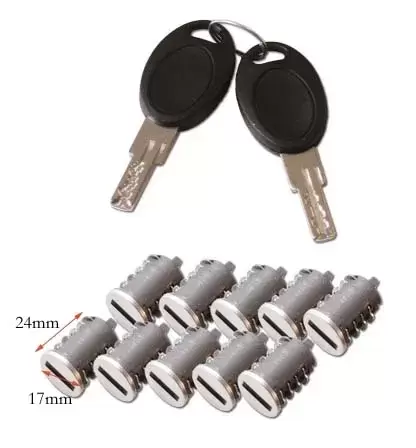 Set of ten cylinders plus two keys to replace and unify all chest and garage door locks with a single key.