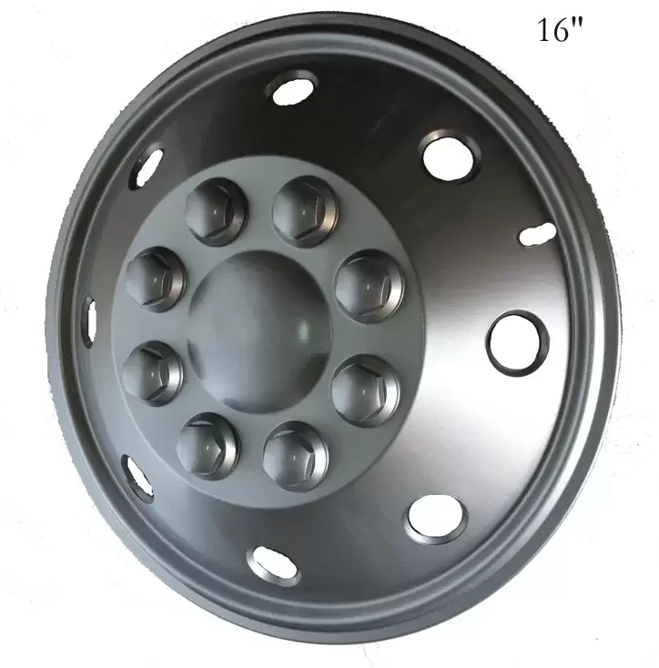 Four 16" motorhome hubcaps, robust plastic construction with aluminum color finish.