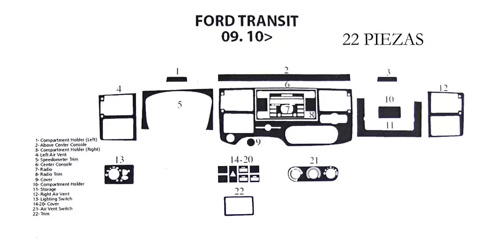 Set Dec. dashboard Ford Transit 09-2010> wood effect 22 pcs. - Ref. CRU203
