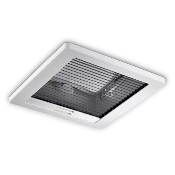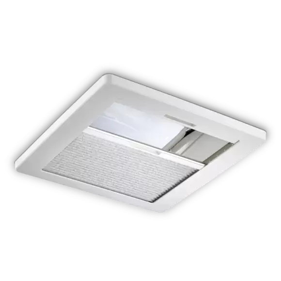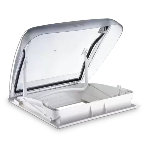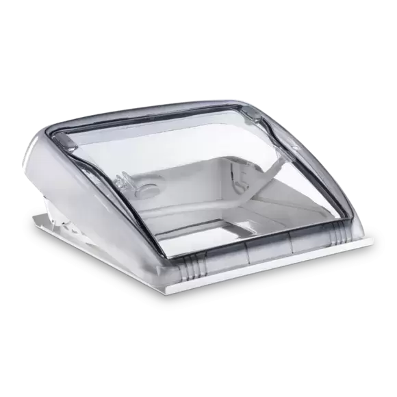 -Dometic Mini Heki Style skylight with transparent cover, closure with multiple opening positions, interior ceiling light with blind and mosquito net.