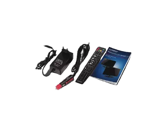 LED TV, bracket, 100-240V power supply, 12-30V car adapter with cigarette lighter socket, remote control, instructions.