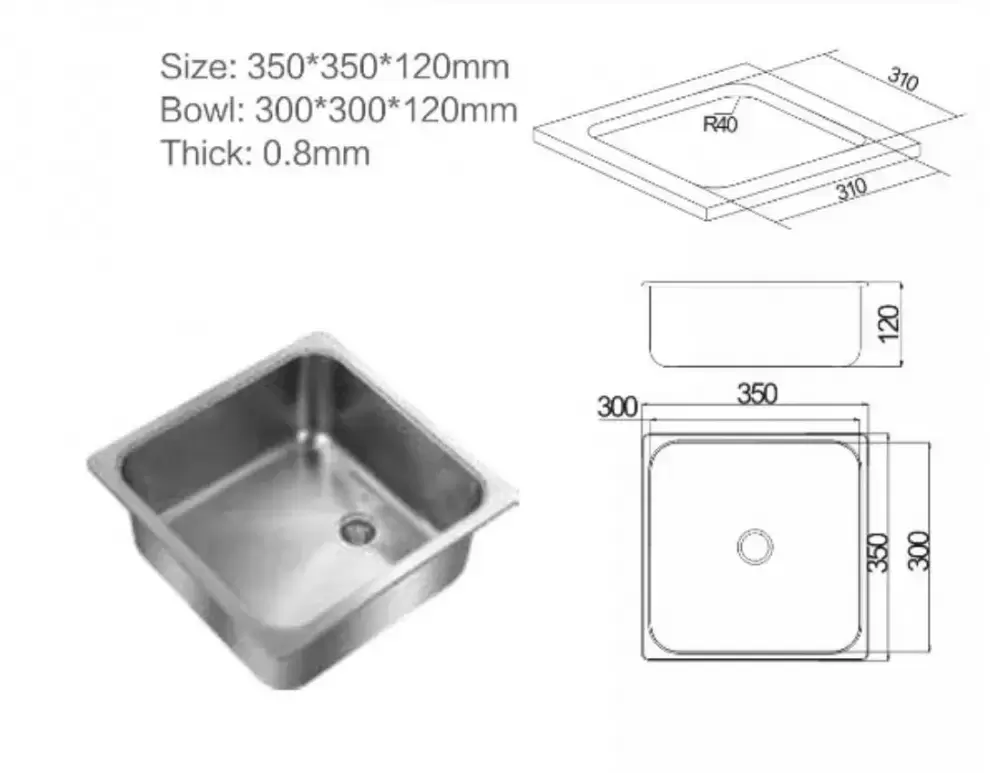 Square stainless steel sink 350x350 for caravans, motorhomes and campers.