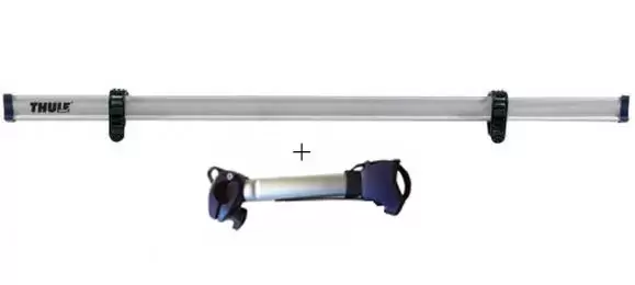 The kit consists of an aluminum Thule rail, plastic protections for supports, plastic straps to fix wheels, terminals, a 28cm clamping arm and the necessary hardware.