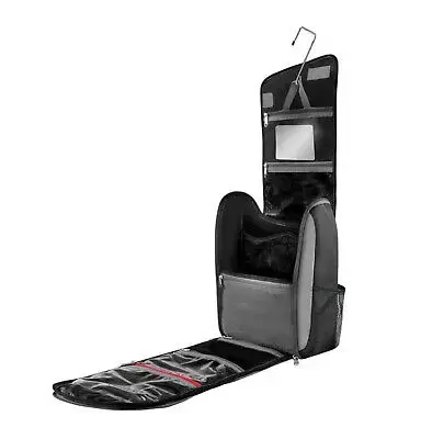 Bathroom bag with many pockets and compartments to store and place everything we need for our toilet anywhere, with a practical hook for hanging and a built-in mirror.