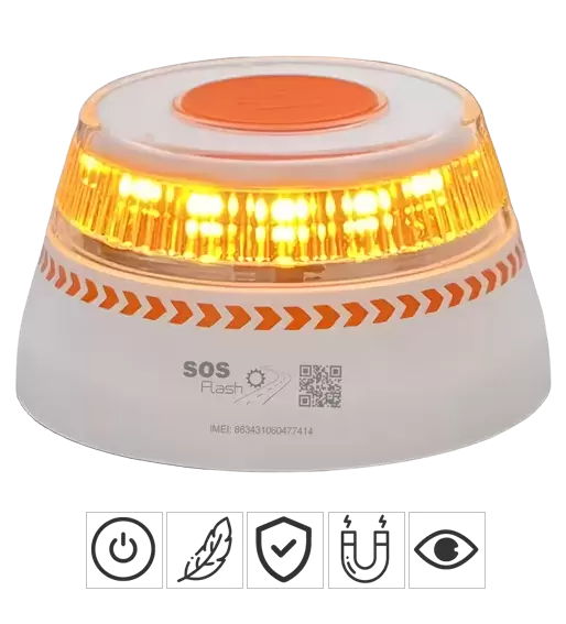 Geolocated beacon / Power button / Visible 360º and 1 km / Easy to store / Rain resistant / Magnetic base / Shockproof case / Anonymous eSIM / Autonomy up to 6 hours / SIM card included / Data included up to 2038 / 3 AA 1.5 V Alkaline Batteries Type LR6