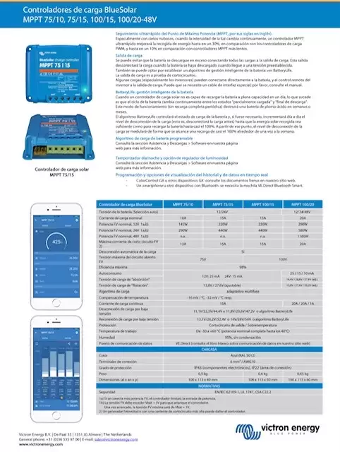 BlueSolar MPPT 75/10 charge controller MPPT 75/15 MPPT 100/15 MPPT 100/20 Battery voltage (Auto selection) 12/24V 12/24/48V Nominal charge current 10A 15A 15A 20A Nominal PV power, 12V 1a ,b) 145W 220W 220W 290W Rated PV power, 24V 1a,b) 290W 440W 440W 580W Rated PV power, 48V 1a,b) nanana 1160W Maximum PV short-circuit current 2) 13A 15A 15A 20A Automatic load disconnection Yes Voltage open circuit maximum PV 75V 100V Maximum efficiency 98% Self-consumption 12V: 25 mA 24V: 15 mA 25 / 15 / 10 mA "Absorption" charge voltage 14.4V / 28.8V / 57.6V (adj.) "float" charging 13.8V / 27.6V (adjustable) 13.8V / 27.6V / 55.2V (adj.) Multi-phase adaptive charging algorithm Temperature compensation -16 mV / °C, -32 mV / ° C resp. Continuous charging current 15A 20A / 20A / 1A Low voltage load disconnection 11.1V/22.2V/44.4V or 11.8V/23.6V/47.2V or BatteryLife algorithm Low voltage load reconnection 13, 1V/26.2V/52.4V or 14V/28V/56V or BatteryLife algorithm Protection Output short circuit / Over temperature Working temperature -30 to +60°C (full rated power up to 40°C) Humidity 95%, no condensation VE.Direct data communication port (see the white paper on data communication on our website) HOUSING Color Blue (RAL 5012) Connection terminals 6 mm² / AWG10 Degree of protection IP43 (electronic components), IP22 (area of connection) Weight 0.5 kg 0.6 kg 0.65 kg Dimensions (H x W x D) 100 x 113 x 40 mm 100 x 113 x 50 mm 100 x 113 x 60 mm STANDARDS Safety EN/IEC 62109-1, UL 1741, CSA C22.2 1a) If more PV power is connected, the controller will limit the power input. 1b) The PV voltage must exceed Vbat + 5V for the controller to start. Once started, the minimum PV voltage will be Vbat + 1V. 2) A PV array with a higher short-circuit current may damage the controller.