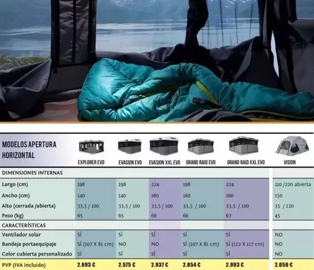 360º view. Easy assembly. Resistant to rain and wind. Includes mattress, ventilation with solar panel that prevents condensation, lighting and storage pockets. Windows with mosquito nets. folding aluminum ladder