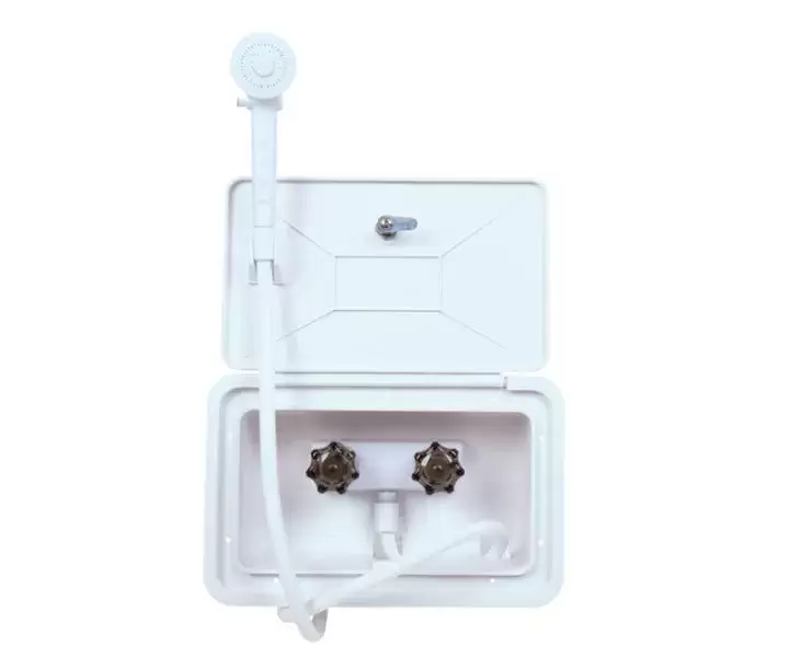 White outdoor shower hot and cold water with lock 340x220 mm for caravans, motorhomes and camper.